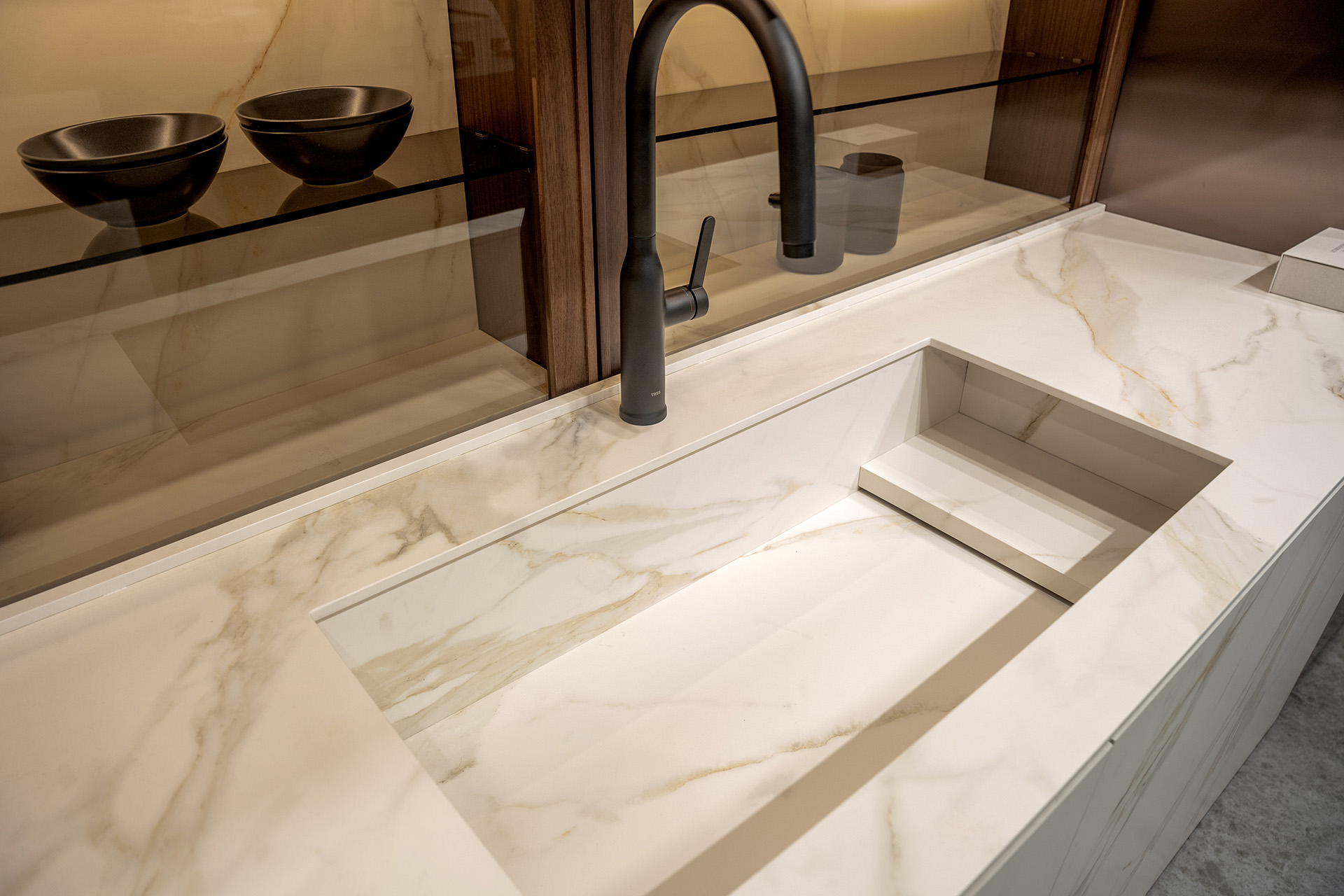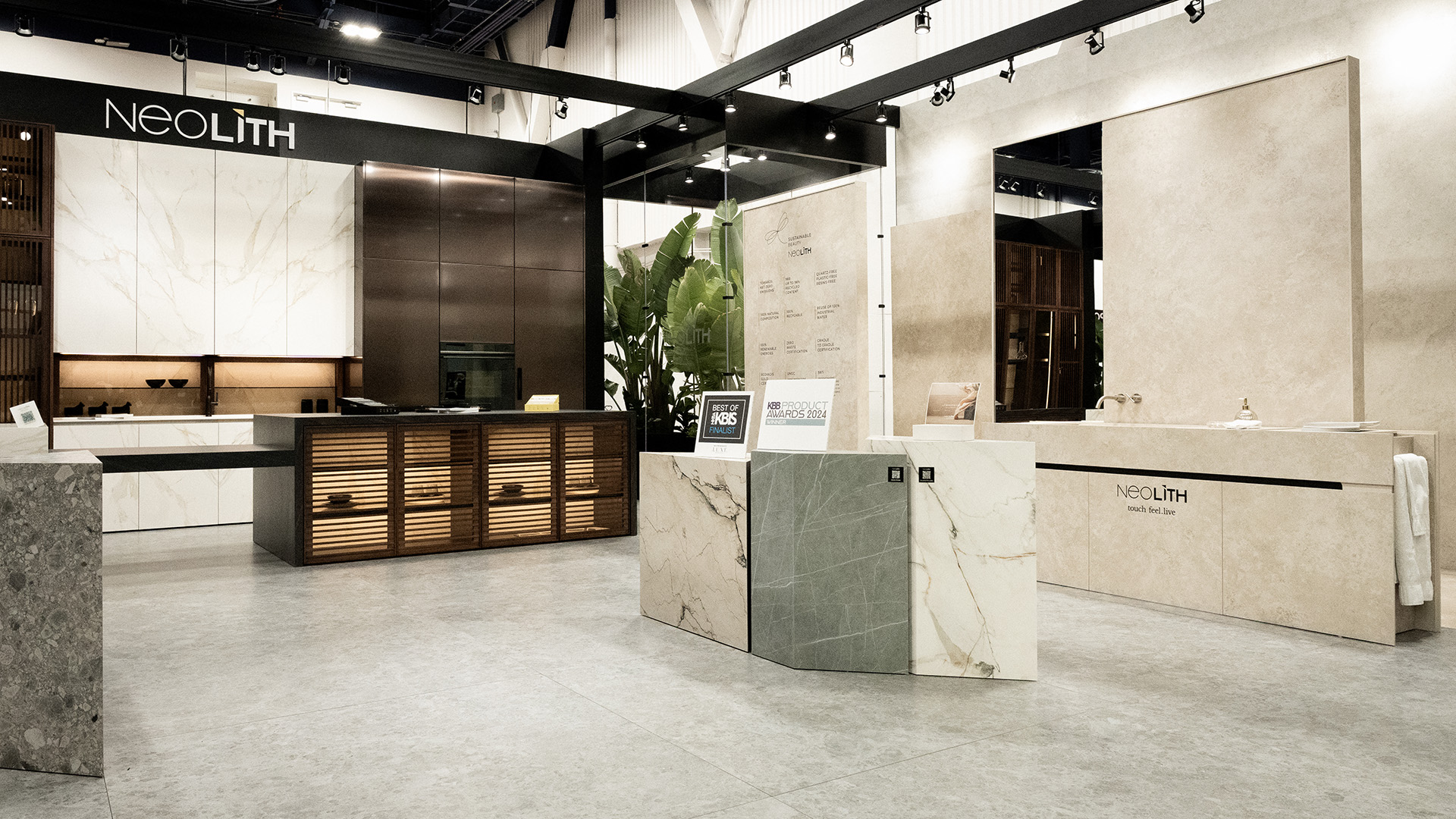 La propuesta combina materiales de alto rendimiento, como Neolith Calacatta Roma Silk, con acabados metálicos y maderas nobles, en una composición equilibrada, sofisticada y funcional. El diseño integra sistemas ocultos, vitrinas iluminadas y módulos inteligentes, todo en un entorno realista que permite experimentar el espacio de forma sensorial.