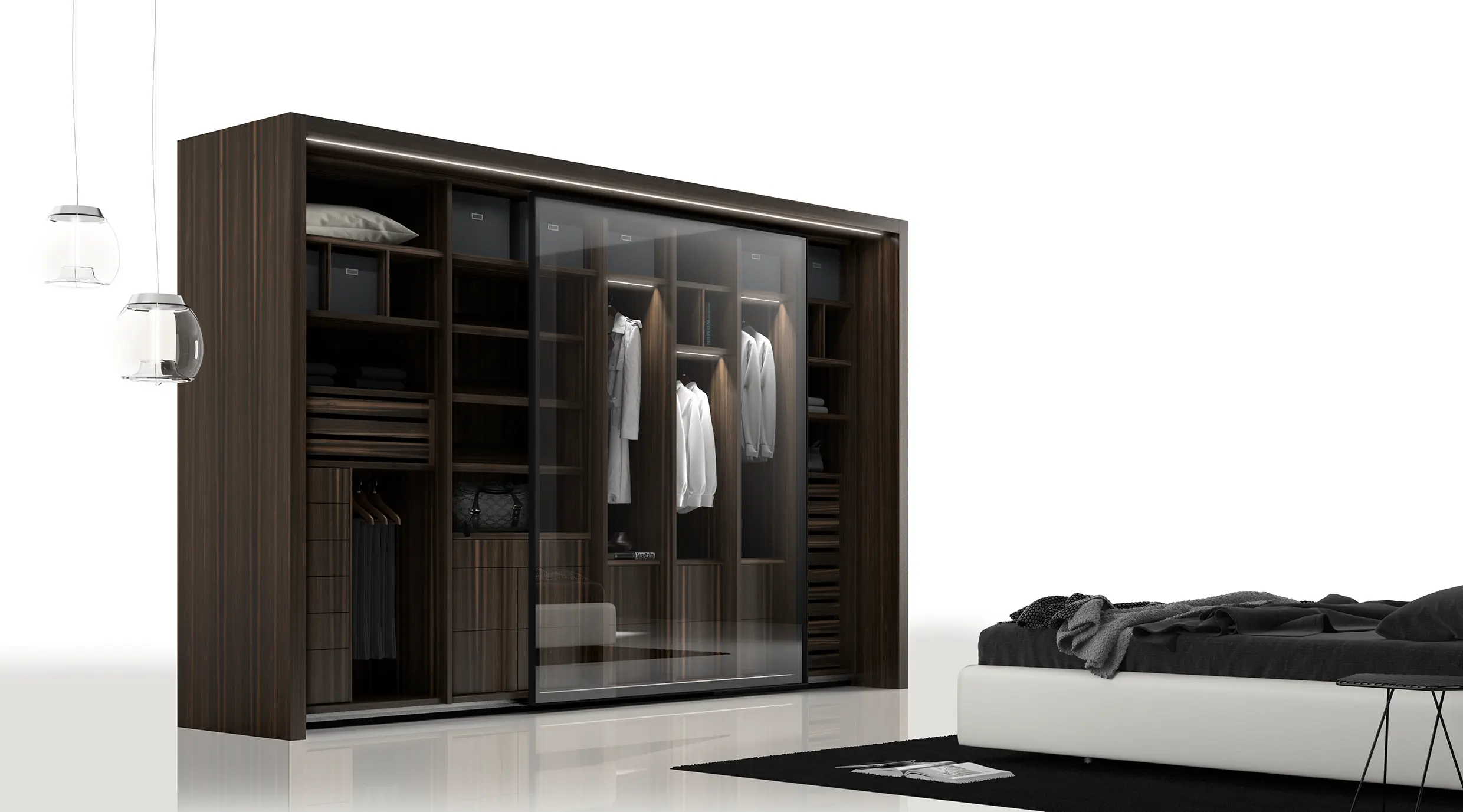 Este armario se presenta como una pieza escultórica dentro del espacio arquitectónico. Su estructura, realizada íntegramente en madera natural de ébano, aporta una calidez elegante y atemporal, mientras que las puertas correderas en cristal gris ahumado suavizan su presencia con un equilibrio perfecto entre opacidad y transparencia.