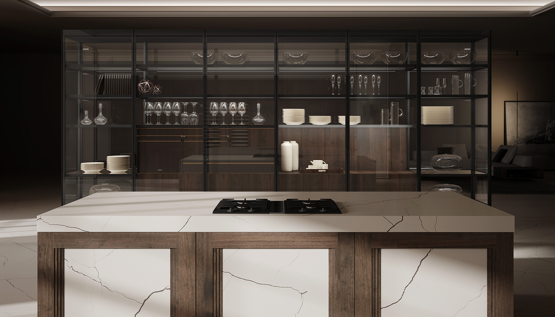 La cocina Step reinterpreta la puerta enmarcada con un lenguaje arquitectónico propio. Su plafón central en porcelánico claro aporta textura y contraste, mientras que el tirador integrado, diseñado como parte de la geometría del conjunto, ofrece una experiencia ergonómica sin alterar la pureza visual.