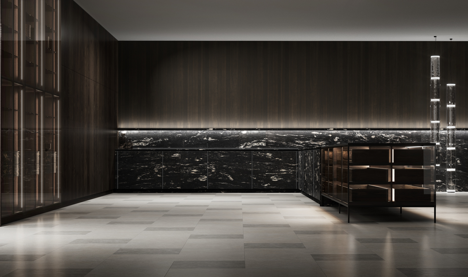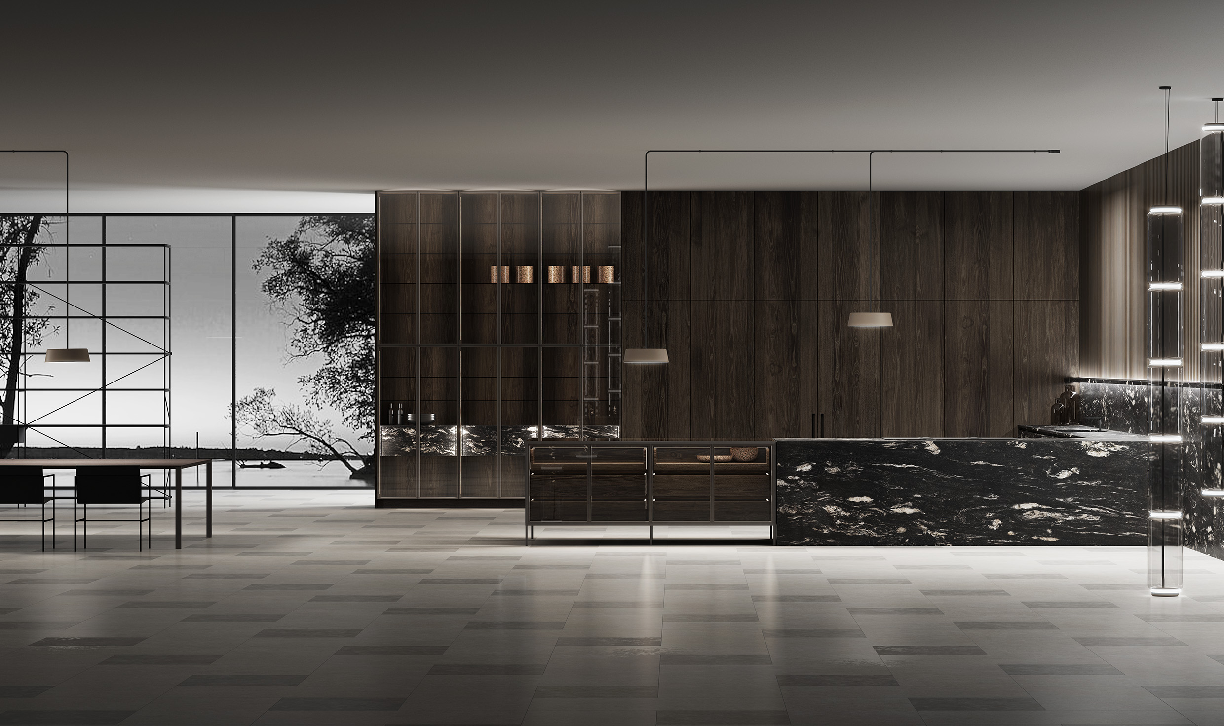 Los muebles bajos con puertas de cristal introducen una sensación de ligereza y sofisticación, ideal para espacios abiertos y luminosos. Las columnas con puertas de cristal transparente revelan un interior cuidado al detalle, donde cajones con acabado porcelánico elevan el nivel de funcionalidad y diseño.
