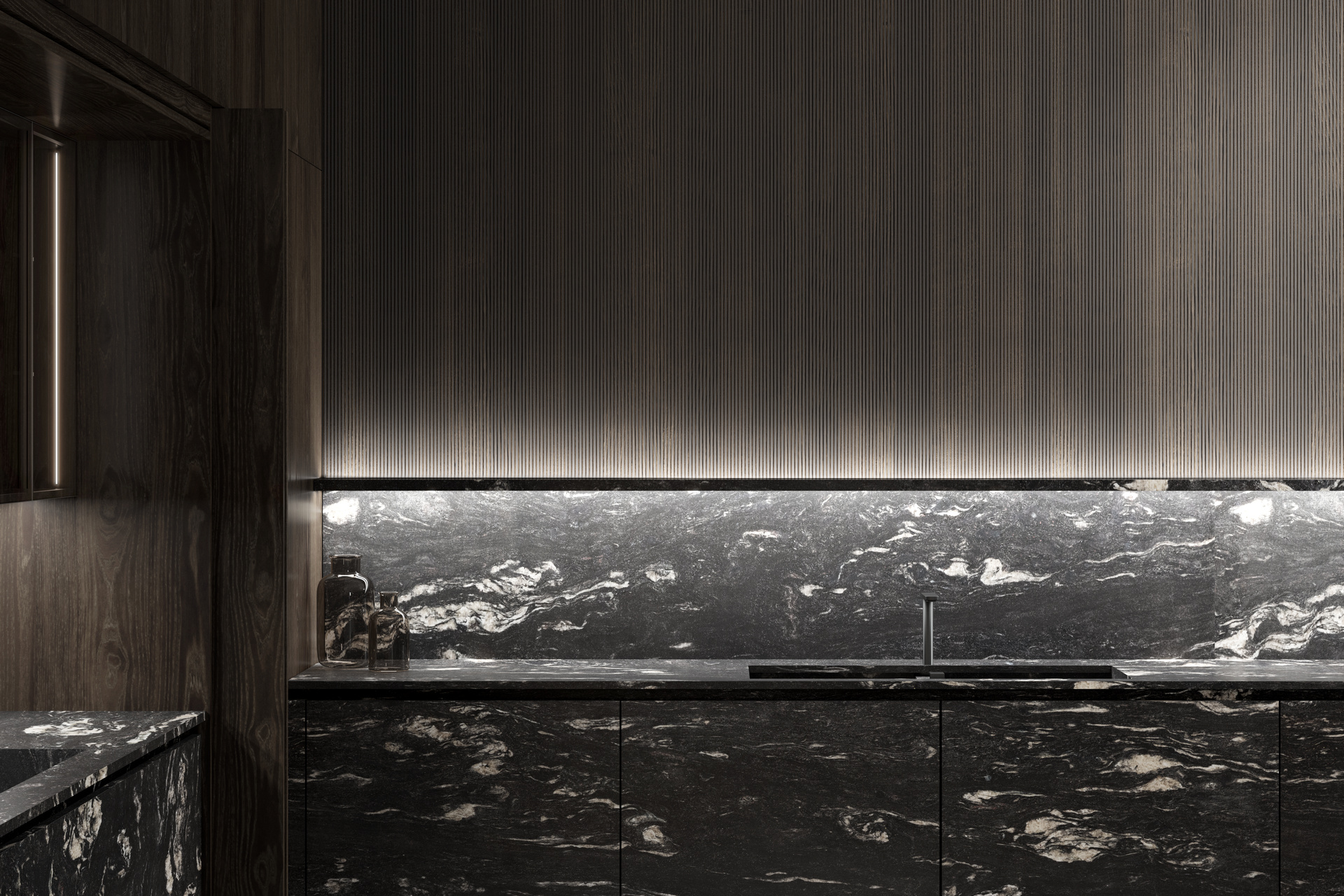 Esta propuesta de cocina contemporánea destaca por la combinación armoniosa entre la calidez del roble rallado y una estética depurada y contemporánea. El uso de madera natural, trabajada con precisión, aporta carácter y textura, mientras que los acabados técnicos de última generación, como el tirador Lyon integrado y la trasera en porcelánico a juego con la encimera, refuerzan la continuidad visual del conjunto.