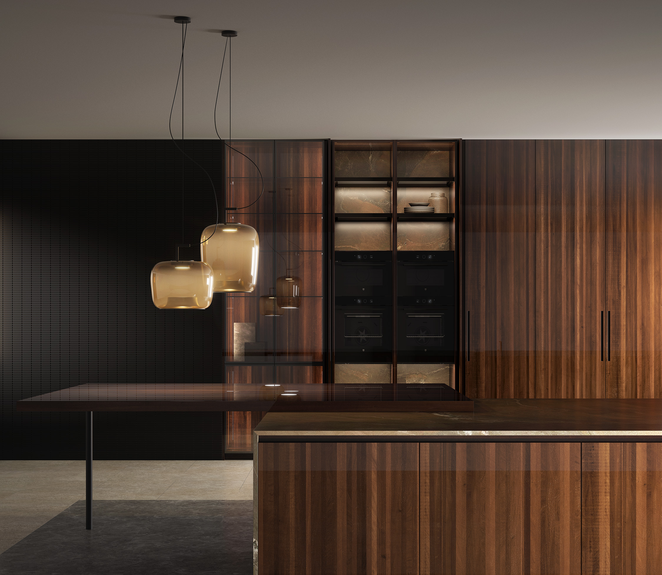 Lujo atemporal con carácter distintivo. Esta cocina se define por la elegancia del acabado Kaoba brillo, un material de excepcional exclusividad que aporta profundidad, luminosidad y una impronta de sofisticación. Su superficie pulida realza las vetas naturales, generando un efecto espejo que eleva el diseño a una dimensión superior.