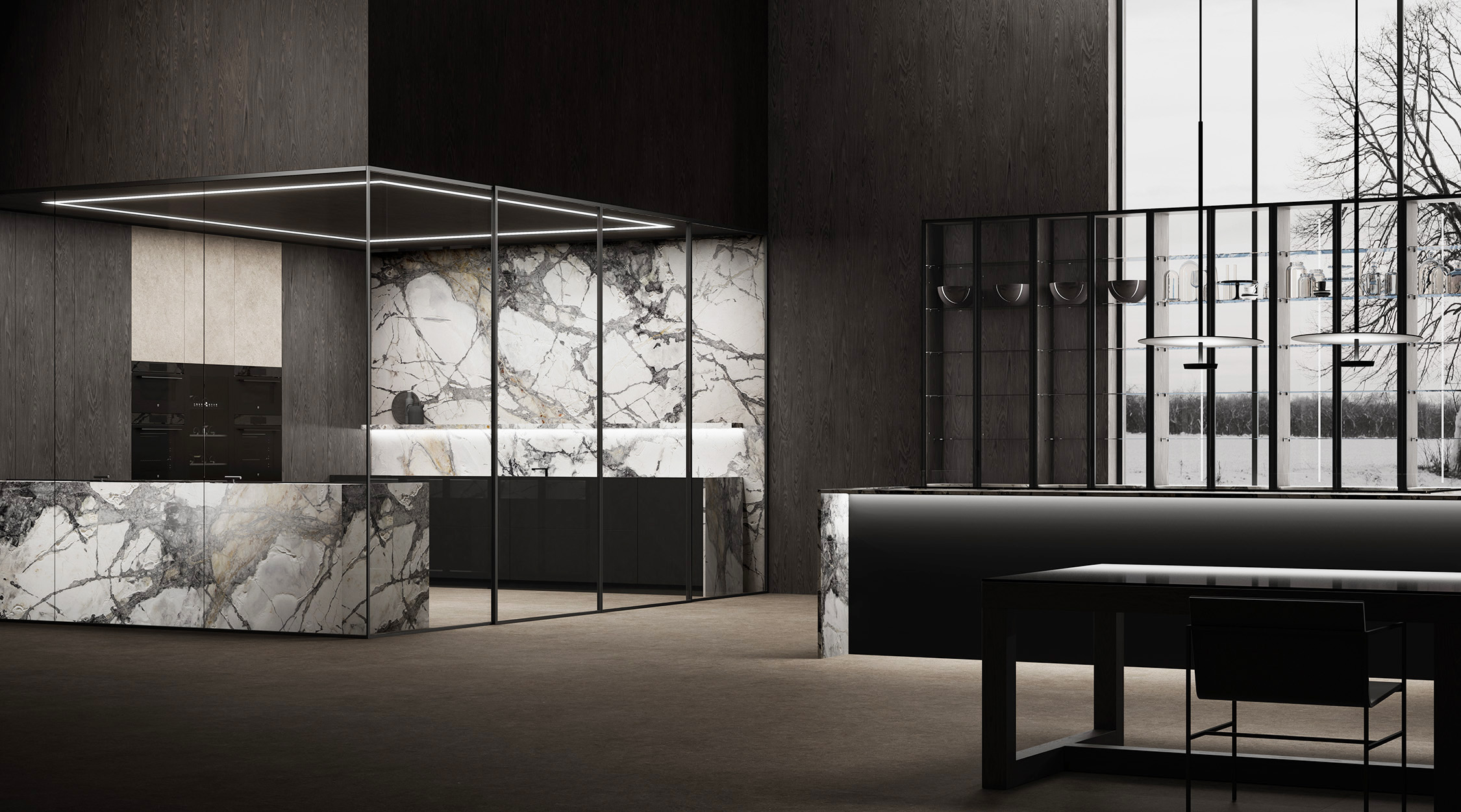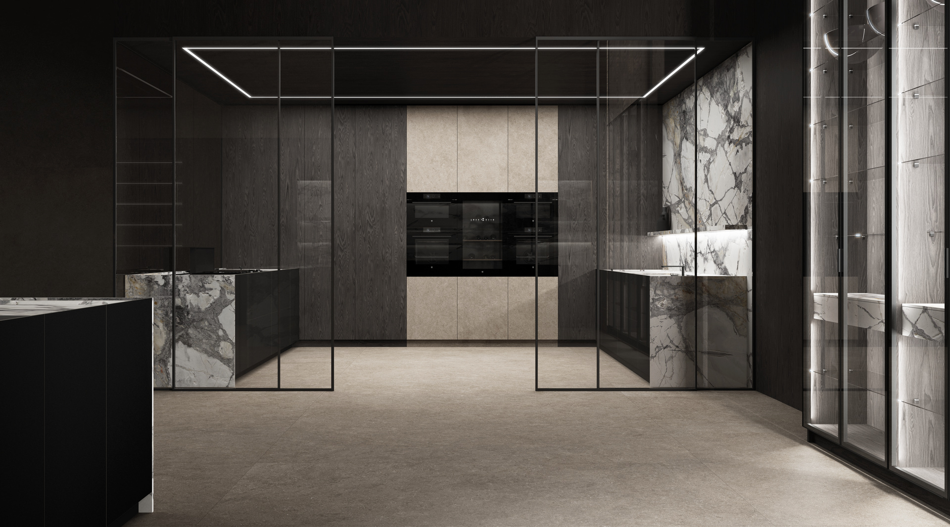 Este proyecto de cocina destaca por la fusión perfecta entre materiales nobles y soluciones arquitectónicas contemporáneas, logrando un ambiente sofisticado y funcional. Un box de cristal transparente aporta ligereza visual y permite una exhibición elegante de piezas de diseño, creando una transición fluida entre la cocina y el salón o comedor, ideal para espacios abiertos.