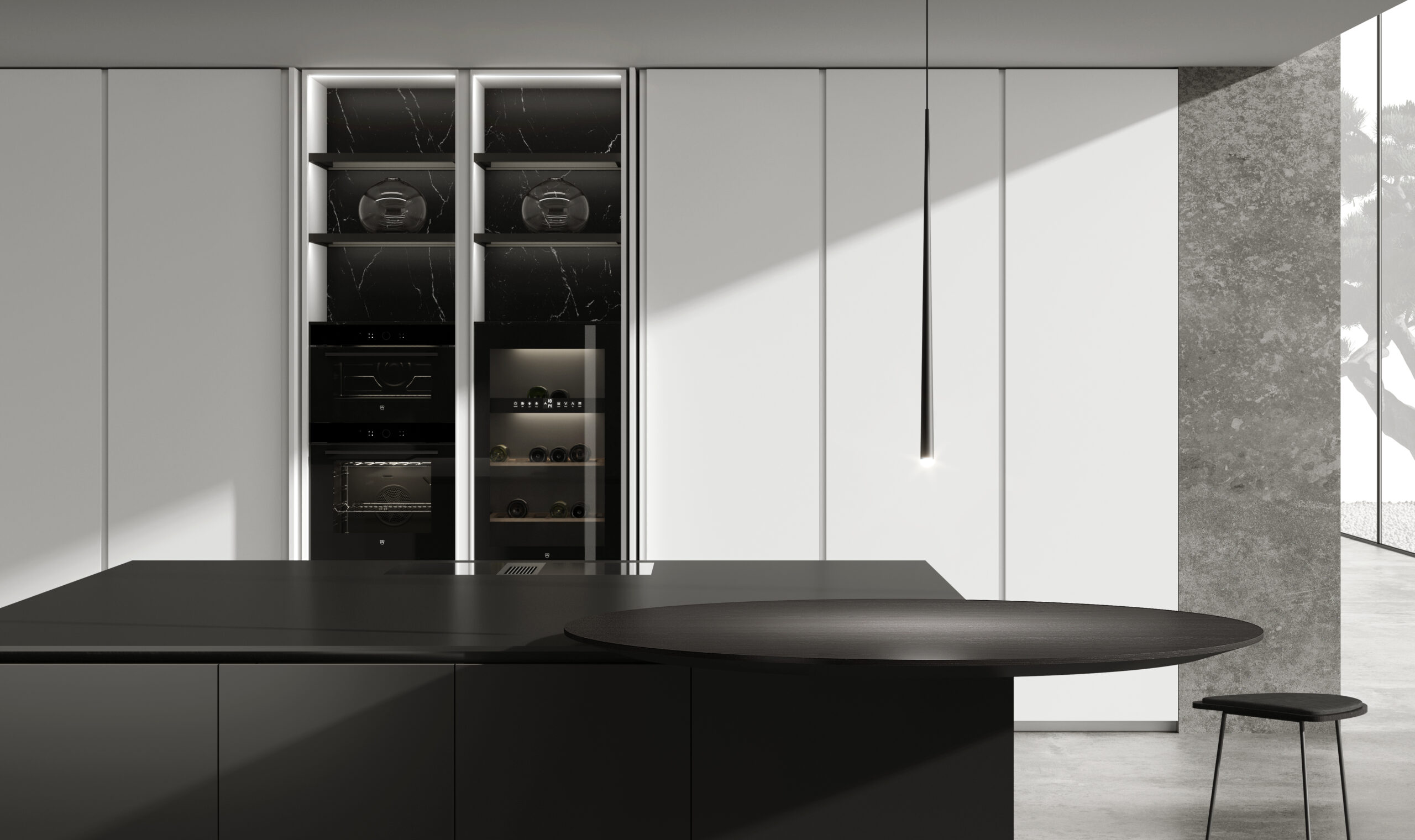 La cocina Smooth en acabados Nero y Blans redefine el equilibrio entre sobriedad y luminosidad en un entorno contemporáneo. Las columnas equipadas con puertas escamoteables ofrecen una solución versátil y discreta, ocultando zonas operativas de horno y micro cuando no están en uso. Destacan unas columnas correderas coplanar que revelan un espacio interior dedicado a la zona de aguas, perfectamente integrada y funcional.