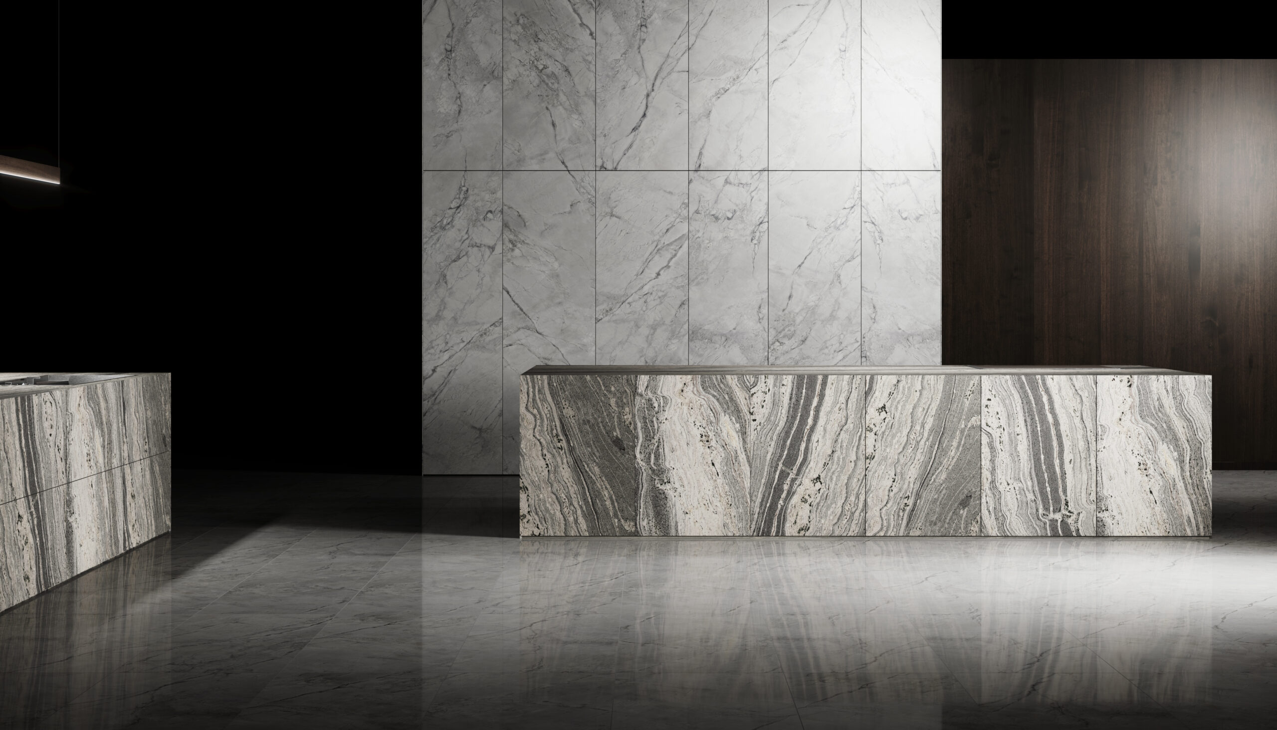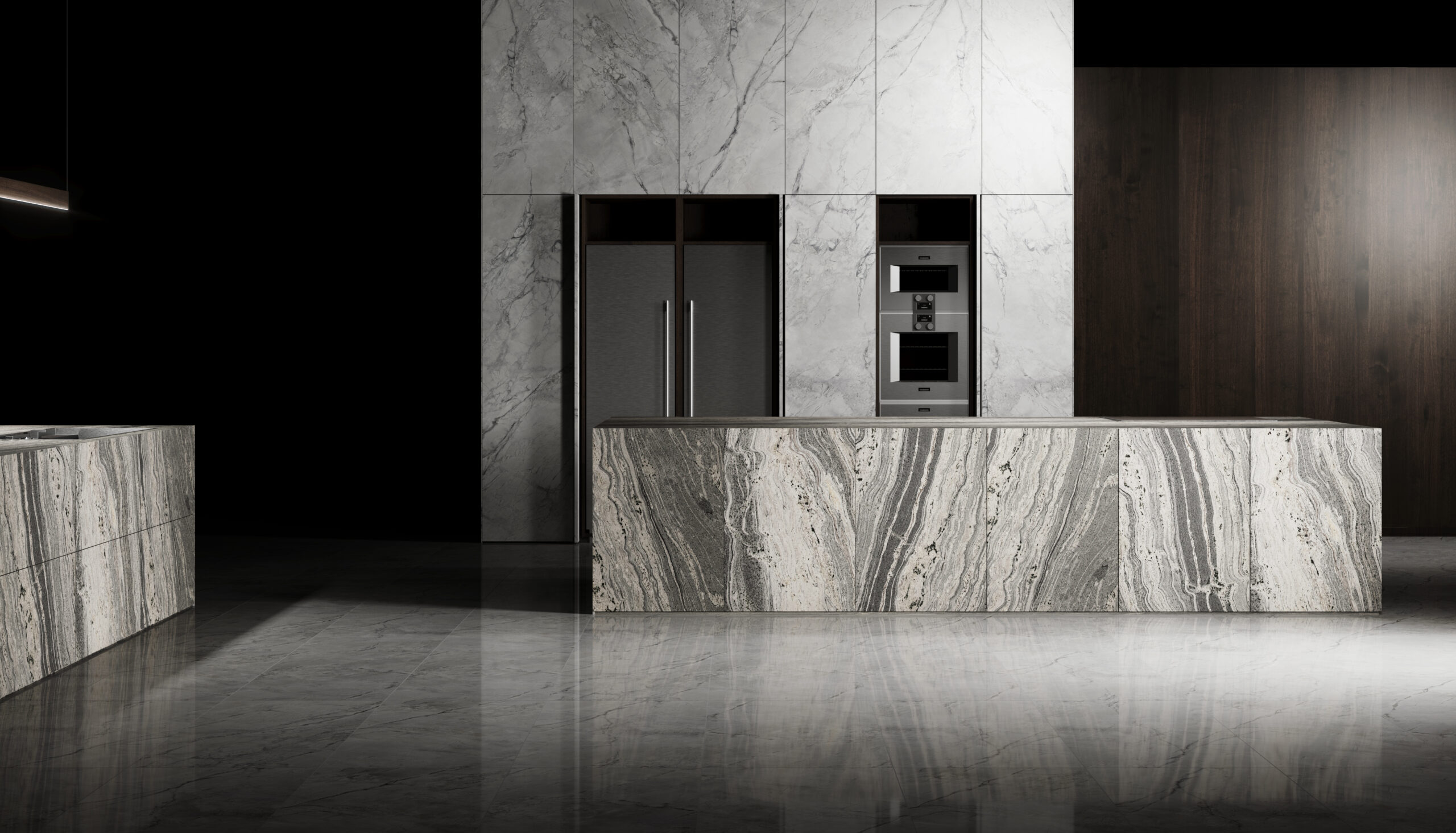 Minimalismo arquitectónico y nobleza en los materiales. Con una estética depurada de líneas rectas y geométricas puras, la cocina Doca se articula a partir de superficies porcelánicas continuas que refuerzan una imagen monocromática, precisa y atemporal. La presencia de una pared revestida en nogal matige introduce calidez y profundidad al conjunto, generando un contraste exquisito con la sobriedad del porcelánico.