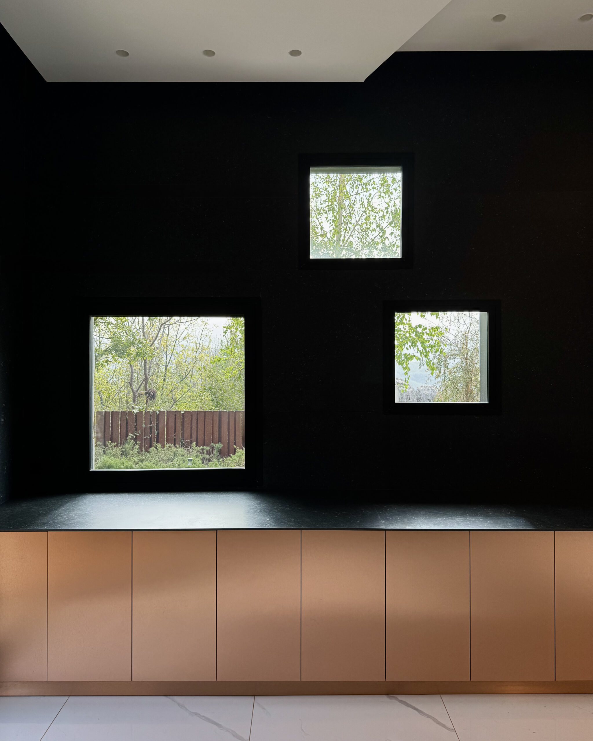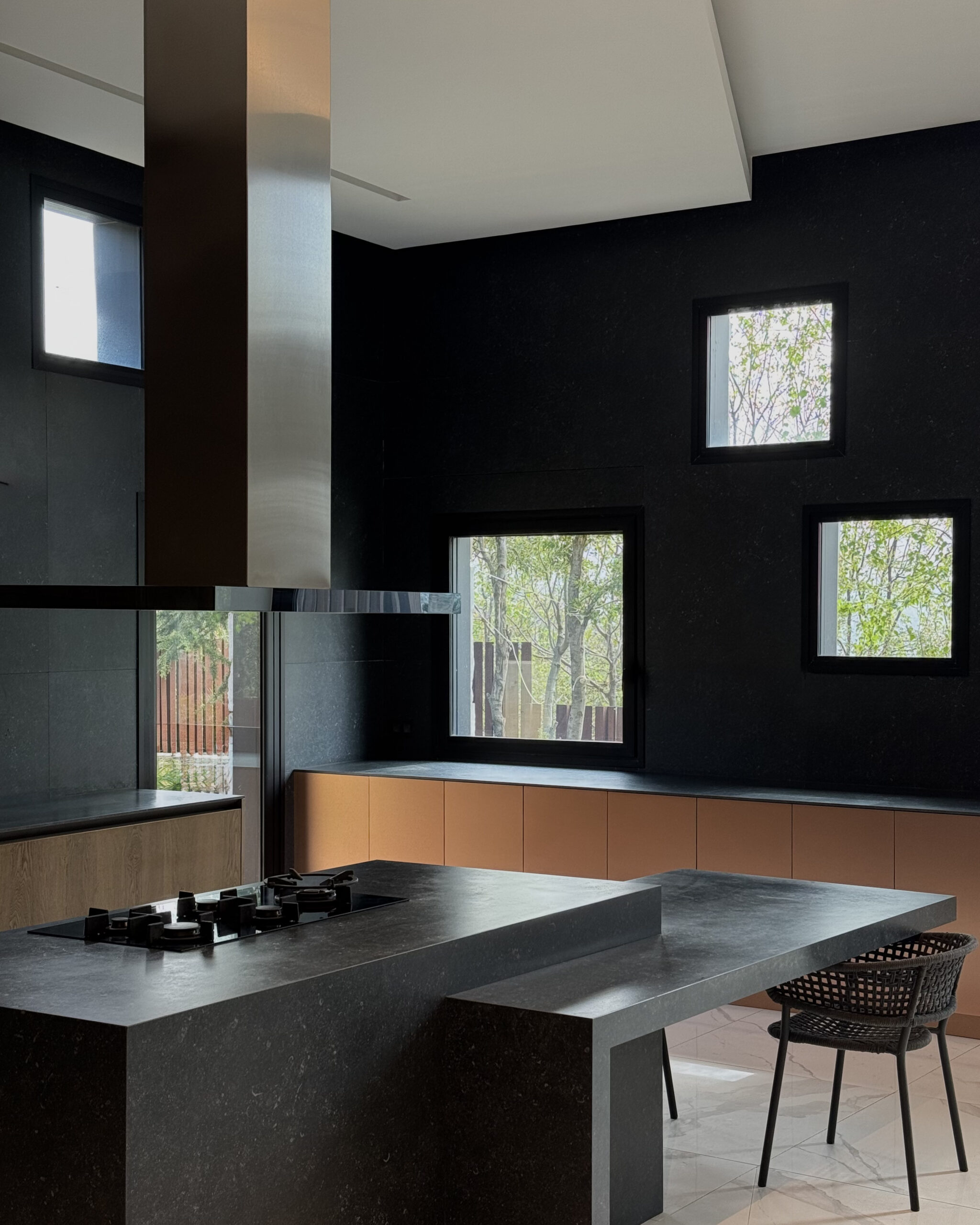 En el plano de fondo, una pared trasera en acabado negro mate actúa como superficie de contraste y profundidad. En ella se han dispuesto ventanas en puntos estratégicos, lo que permite optimizar la entrada de luz natural y enmarcar visuales exteriores, generando una atmósfera envolvente y refinada.