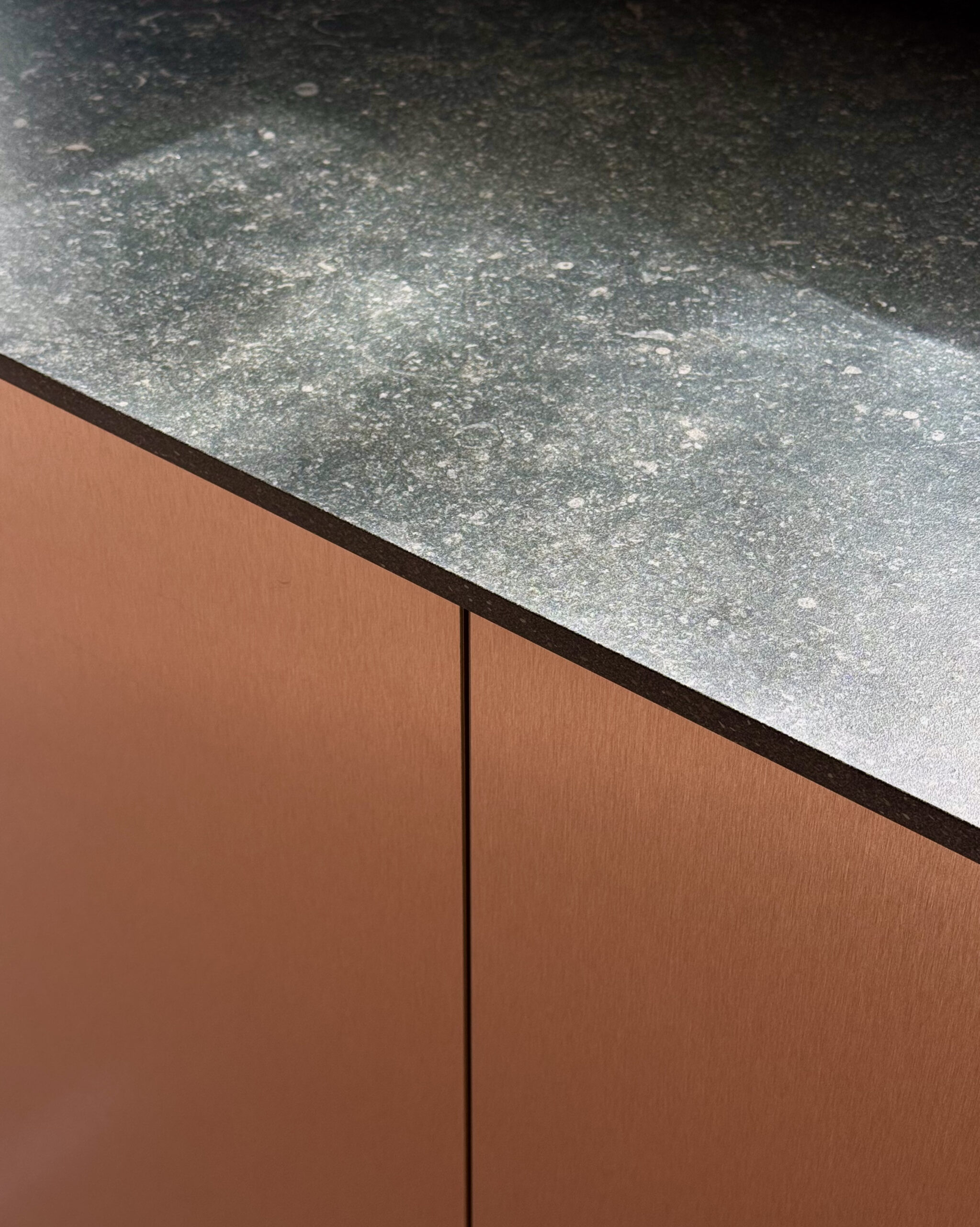 El mobiliario vertical y los módulos bajos integrados se presentan en chapa natural de roble fumé con nudos visibles, aportando textura, calidez y carácter al conjunto. En contraste, los módulos bajos exentos han sido ejecutados en metal con acabado bronce, introduciendo un lenguaje más industrial y elegante que dialoga armoniosamente con la madera.